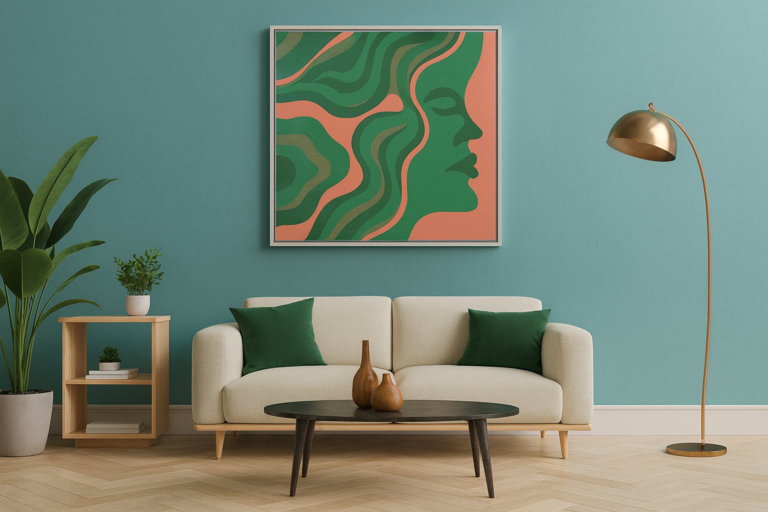 Green lines float across coral like someone turned "inner peace" into a vibe check.